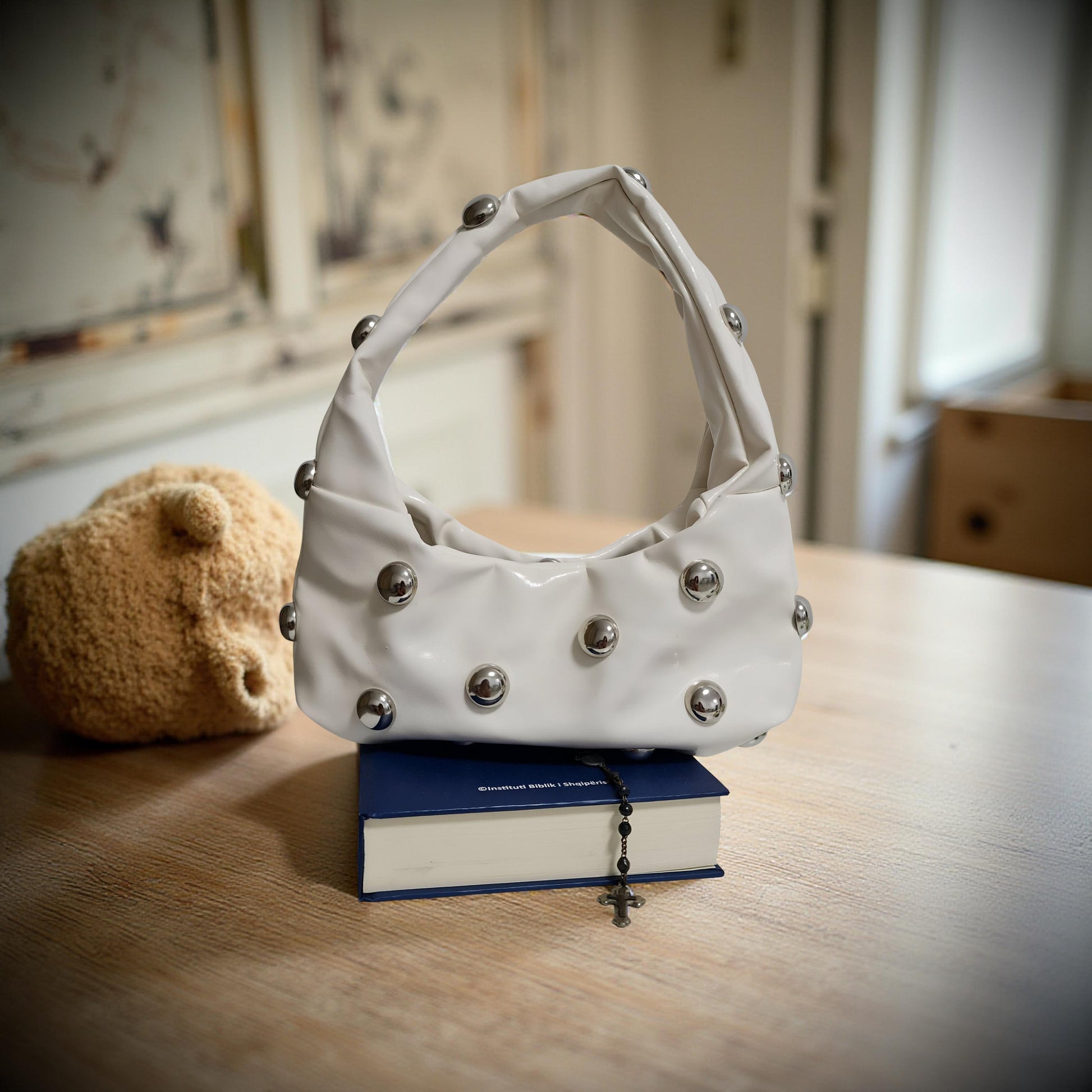 This is a bold white handbag made from a glossy, leather-like material. It features a chunky, modern handle and is adorned with silver dome studs all over, giving it a distinctive edgy look. The structured yet soft silhouette makes it a standout accessory, perfect for fashion-forward outfits and statement styling.